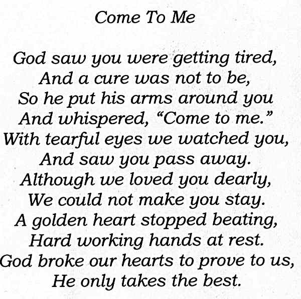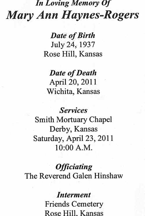 Funeral services were conducted this morning at Smith Family Mortuary on Rock Road in Wichita. Classmates and spouses attending were Richard & Paula Pearson, Don & Charlene Davis, James & Carol Walton, Dick & Leota Albright, Marion Futhey and Jack Carr. The funeral program is shown below (click for a larger version).